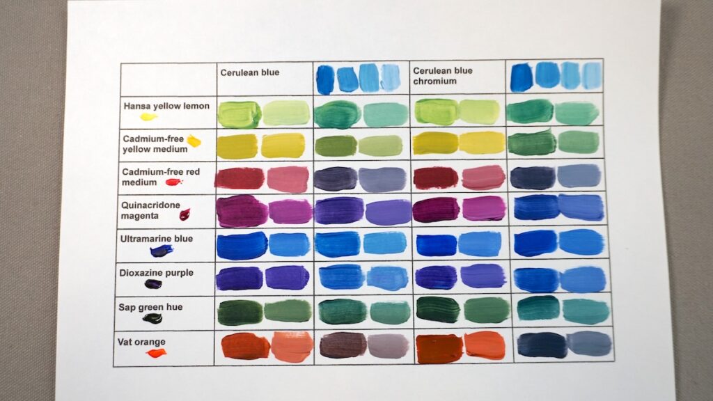 The one small difference I noticed was that cerulean blue is more opaque than the chromium version so some of the cerulean mixes seemed a touch chalkier than the chromium mixes.