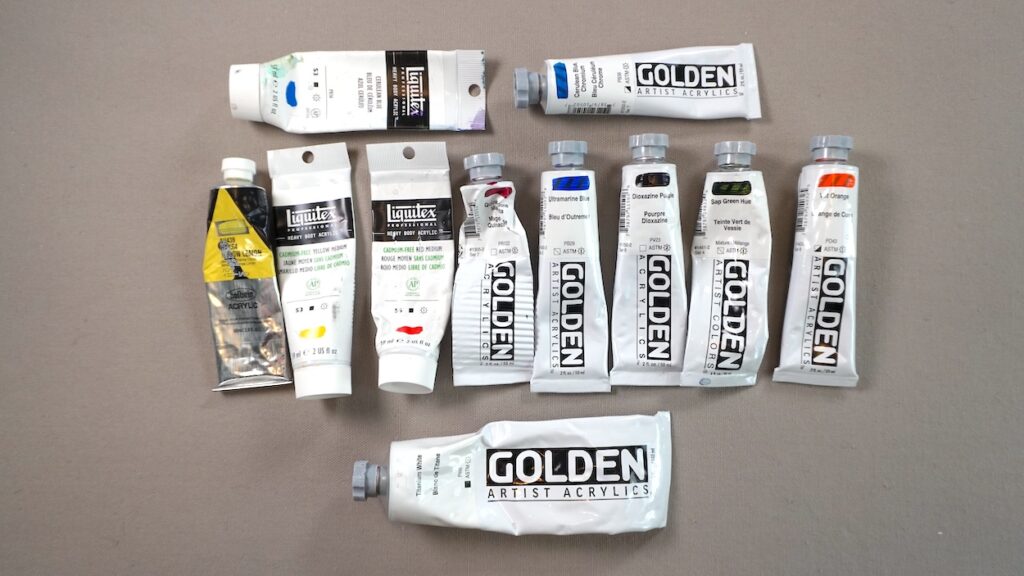 For today’s colour mixing test, I’m using some very common acrylic paint colours from around the colour wheel, plus titanium white: