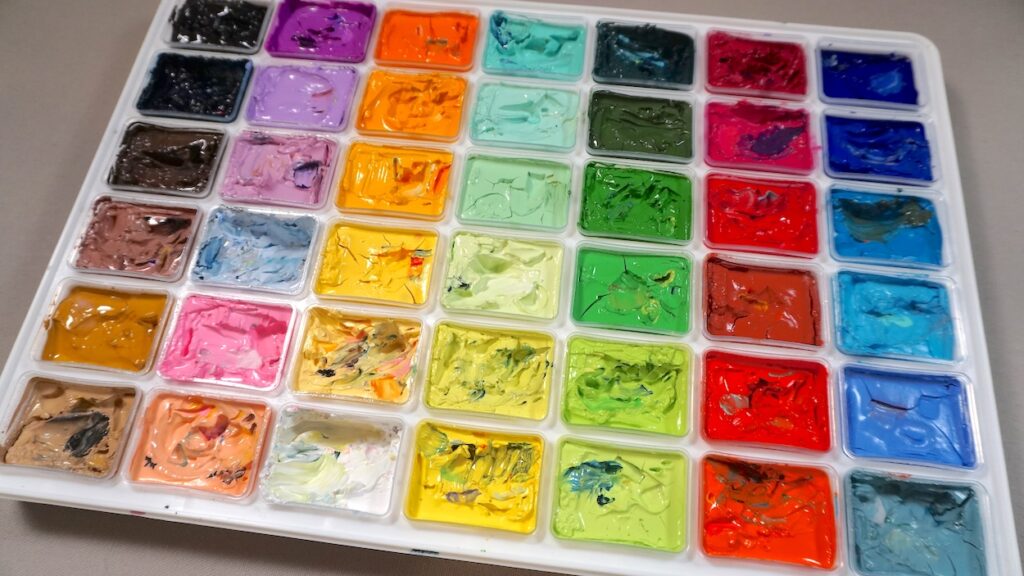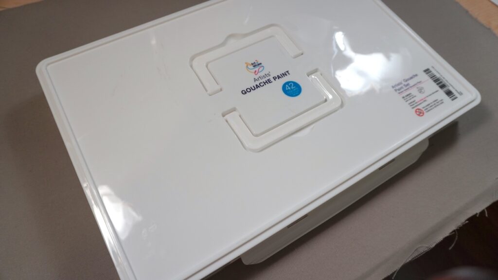 Let’s take a look at the paint itself. Art Whale gouache comes in 50 ml cups of thick paint. The set I have has 42 colours, with a large range of colours, including neutrals. The cups come in a large tray with handles, so it’s fairly portable. It weighs a ton though – I’m talking pounds. It takes a while to set up initially because you need to peel a plastic cover off each, in addition to removing the lids.